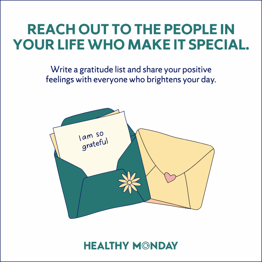 This Monday, start the week by writing your own gratitude list that focuses on the people who make your life special. And although writing a gratitude list only takes a few minutes, it will trigger feelings of love and thankfulness which will resonate with you throughout the week.
